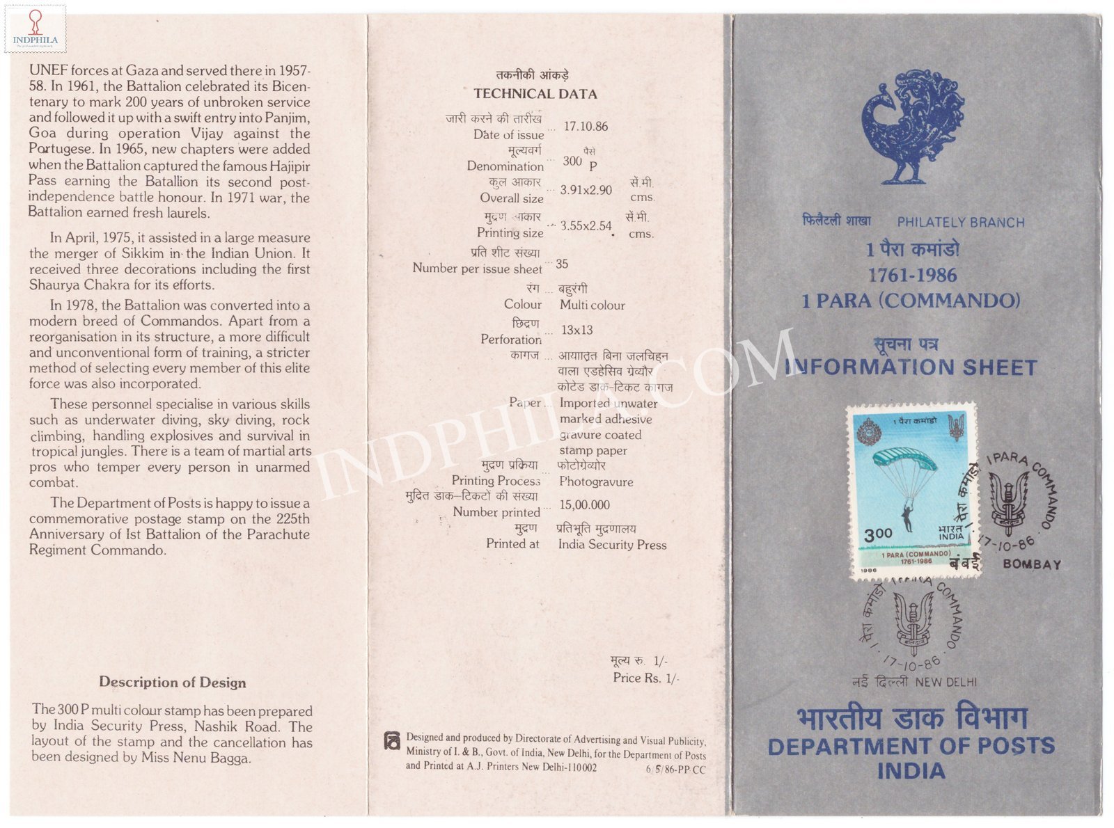 1 Para Commando Brochure with First Day Cancellation 1986 Issued By Postal Department