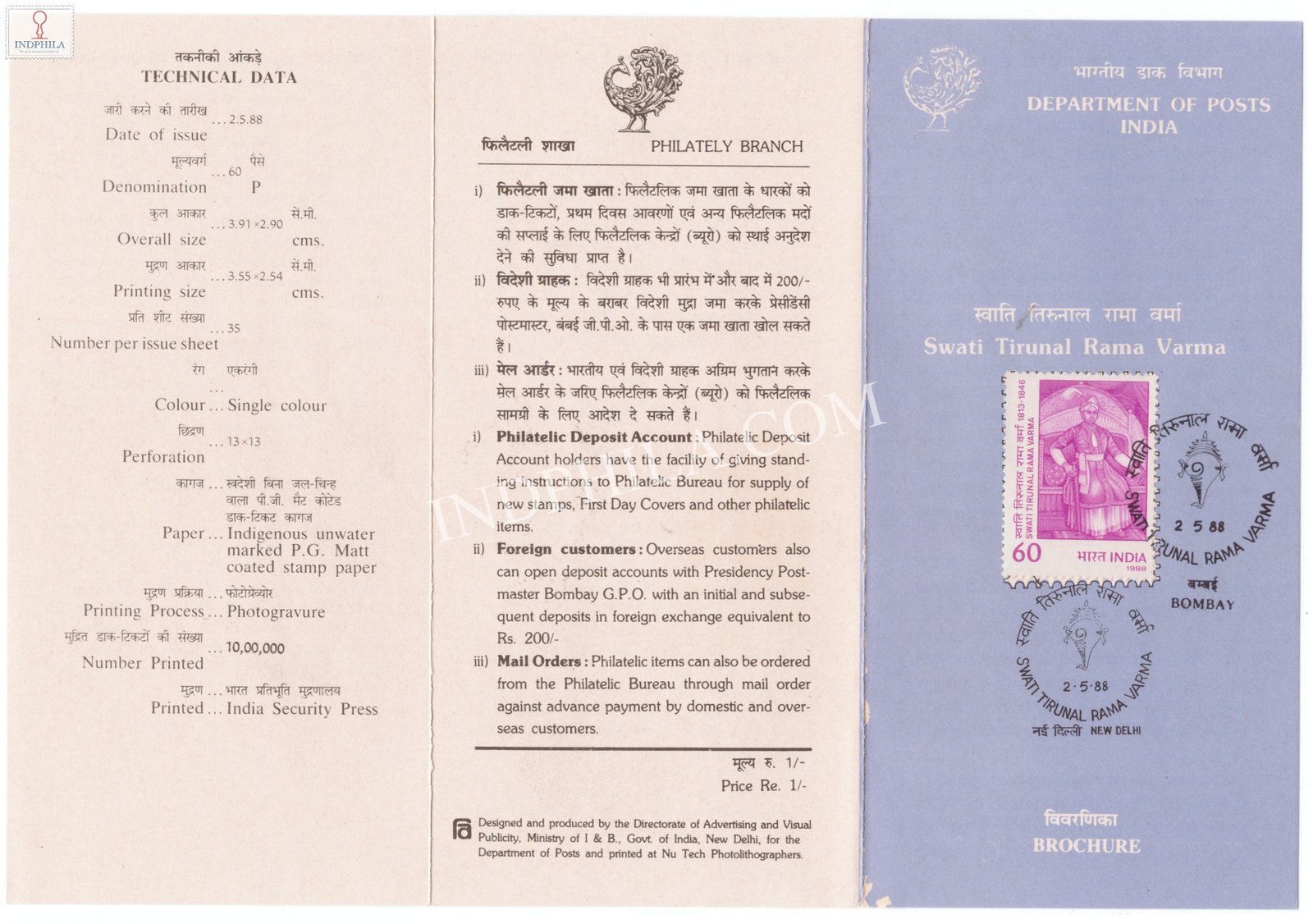 175th Birth Anniversary of Swati Tirunal Rama Varma of Travancore Brochure with First Day Cancellation 1988 Issued By Postal Department