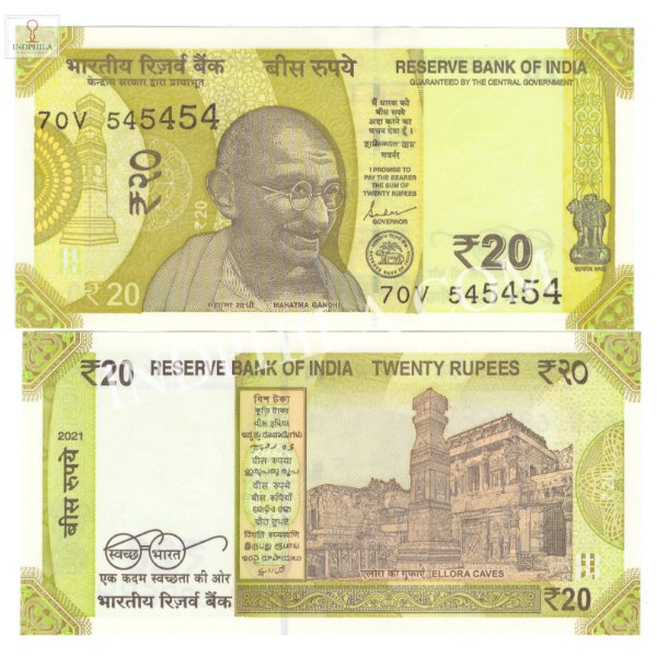 20 Rupees Note Shakti Kanta Das Governor Inset Plain 2021 Tribling Number 545454 – Issued By RBI