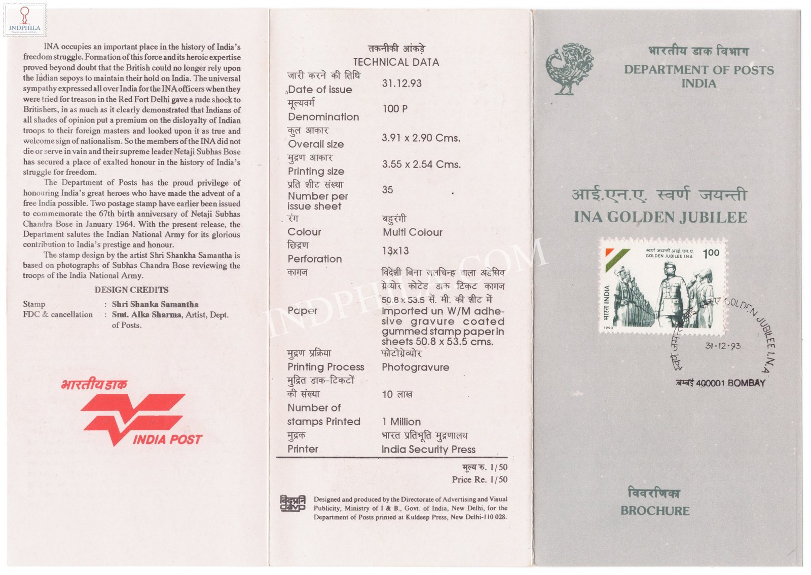50th Anniversary of Indian National Army INA Brochure with First Day Cancelation 1993 Issued By Postal Department