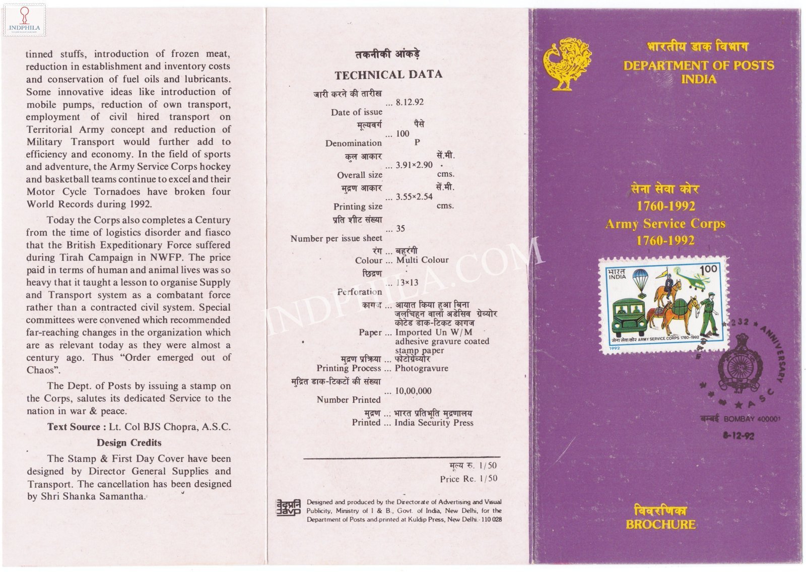 Army Service Corps Brochure with First Day Cancelation 1992 Issued By Postal Department
