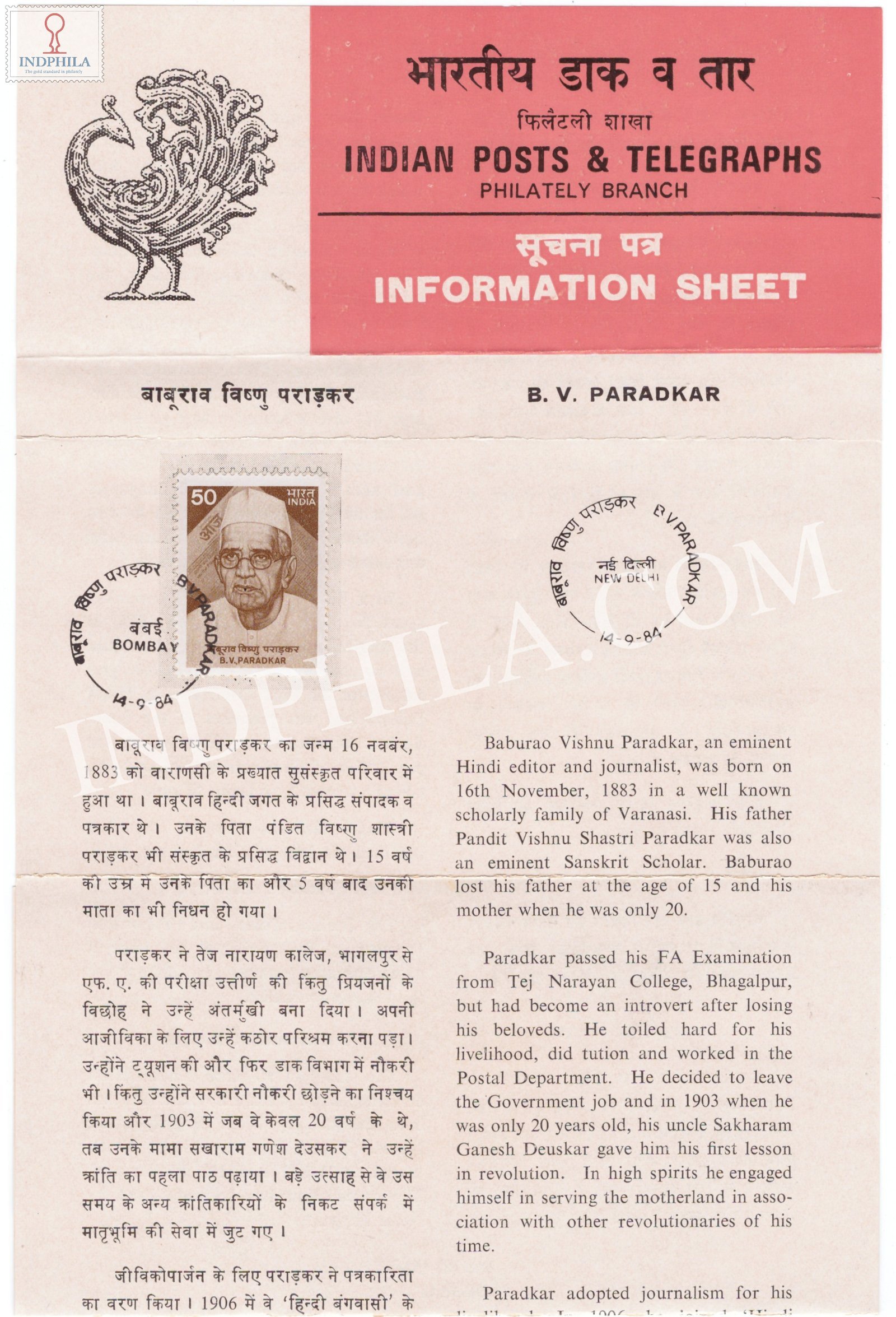 Baburao Vishnu Paradkar Brochure with First Day Cancellation 1984