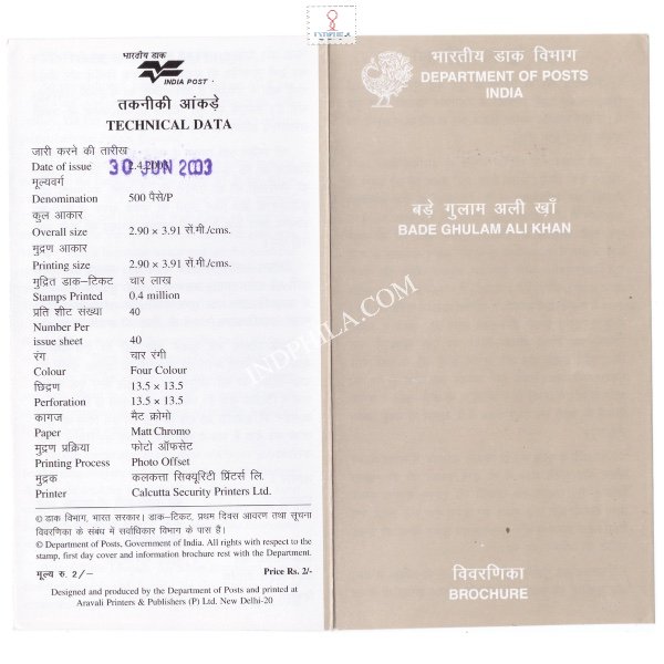 Bade Ghulam Ali Khan Birth Centenary Brochure 2003 Issued By Postal Department