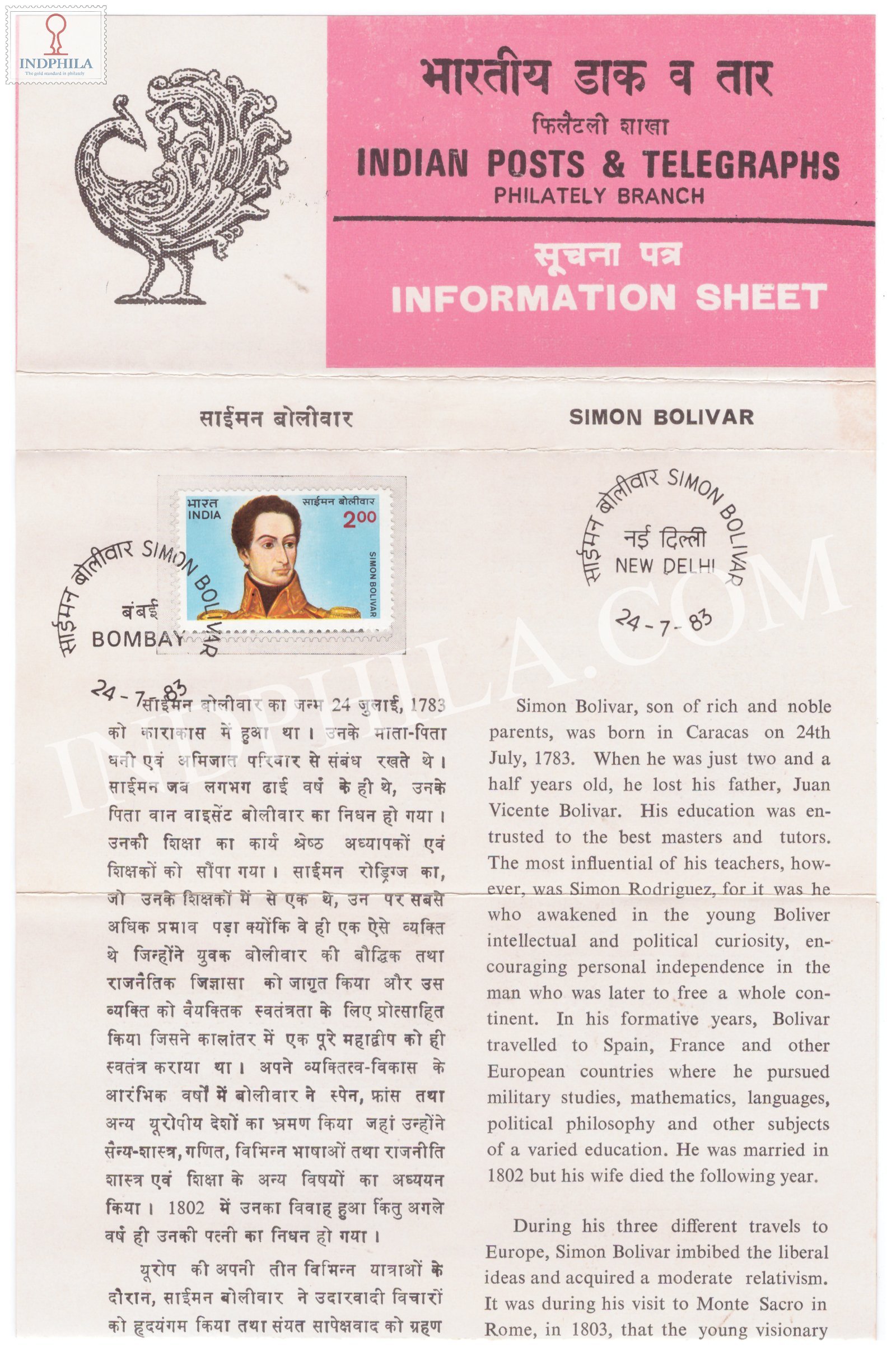 Birth Bicentenary of Sim Bolivar Brochure with First Day Cancellation 1983