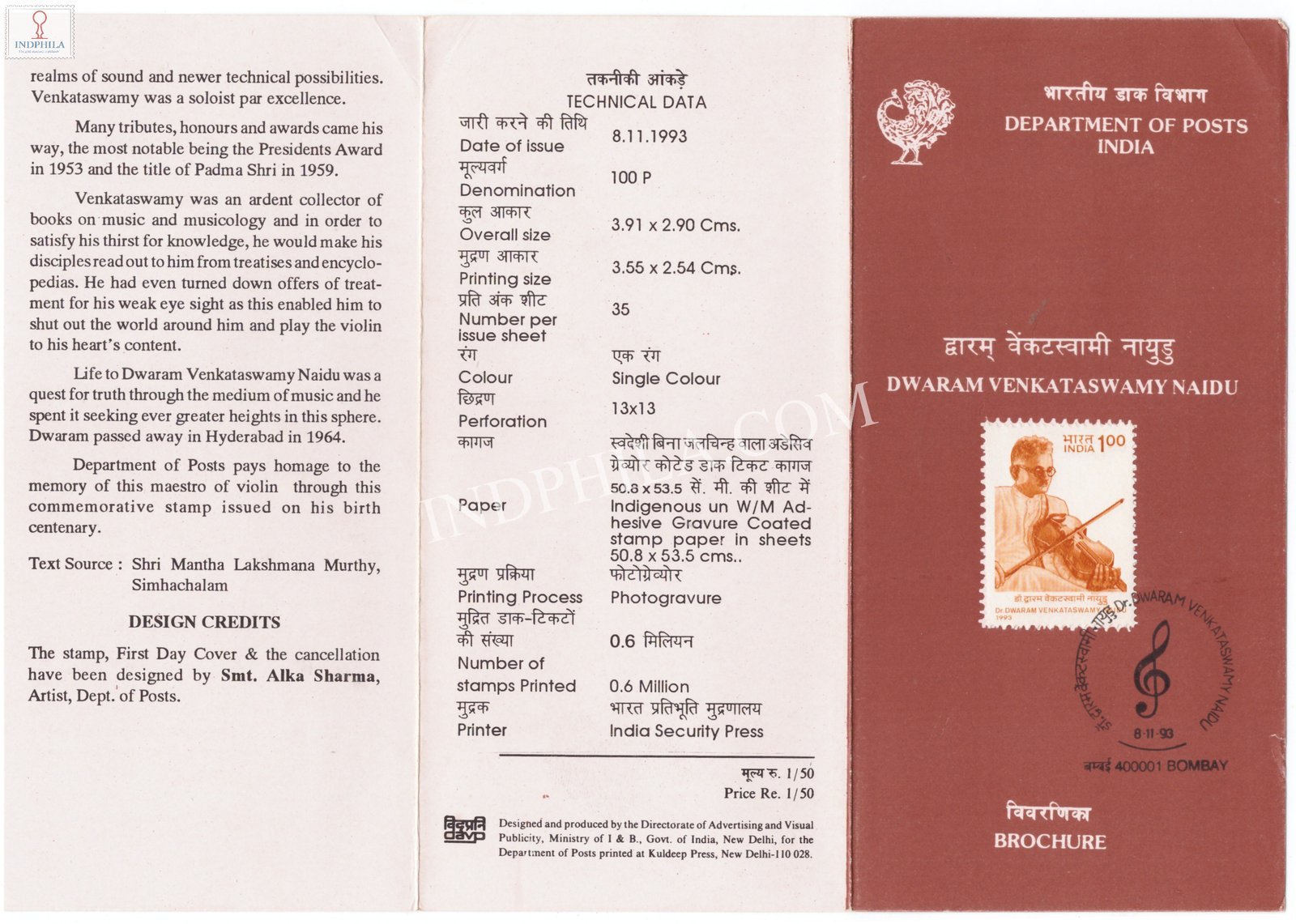 Birth Centenary of Dwaram Venkataswamy Naidu Brochure with First Day Cancelation 1993