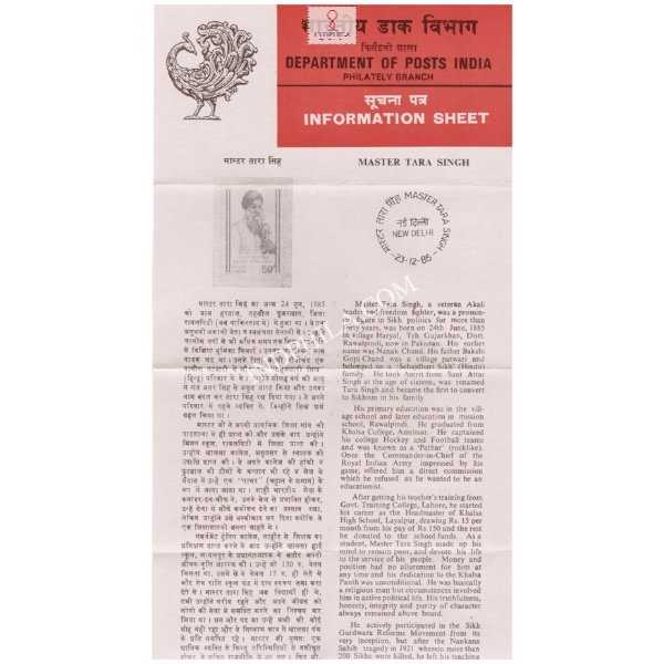Birth Centenary of Master Tara Singh Brochure 1985 Issued By Postal Department