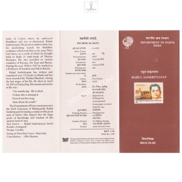 Birth Centenary of Rahul Sankrityayan Brochure 1993 Issued By Postal Department
