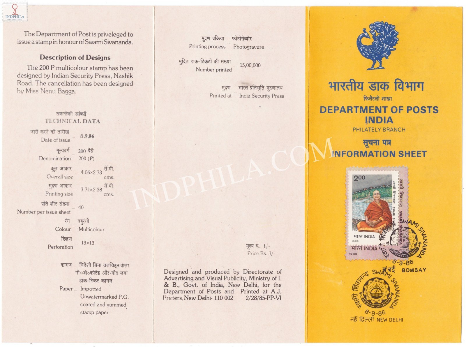 Birth Centenary of Swami Sivananda Brochure with First Day Cancellation 1986