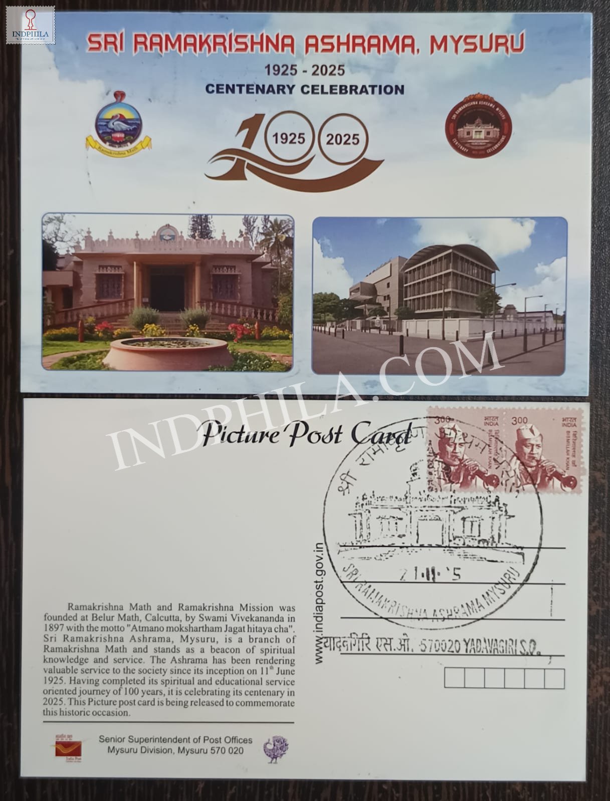 Cancelled Picture Post card of Centenary Celebration of Sri Ramakrishna Ashrama Mysuru 2025 with Inaugural Day Permanent Pictorial Cancellation Issued By India Post