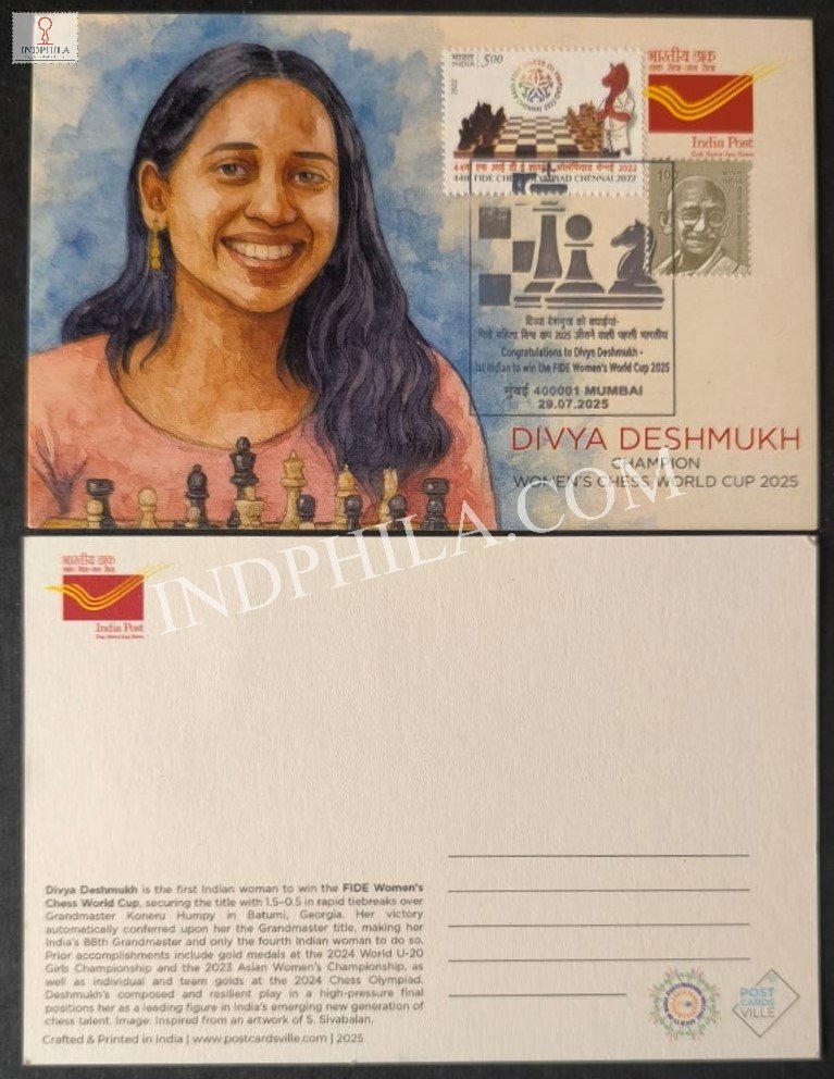 Cancelled Picture Postcard of Congratulations to Divya Deshmukh 1st Indian to win the Fide Women’s World Cup 2025 Issued By India Post