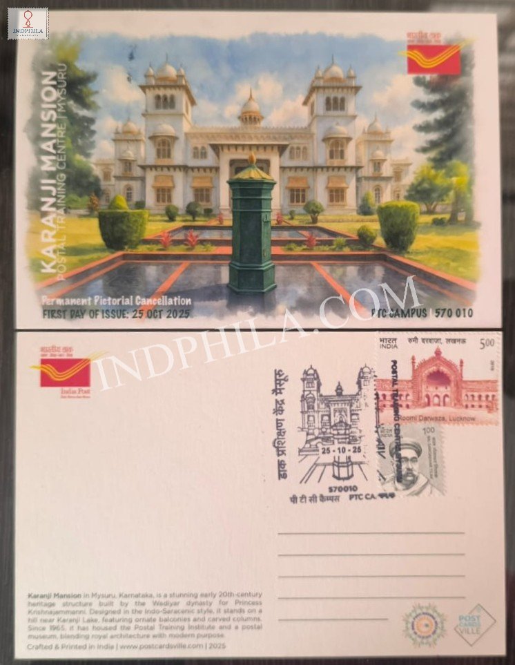 Cancelled Picture Postcard of Karanji Mansion PTC Campus ( Postal Training Centre Mysore ) with first day issue Permanent Pictorial Cancellation 2025 Issued By India Post