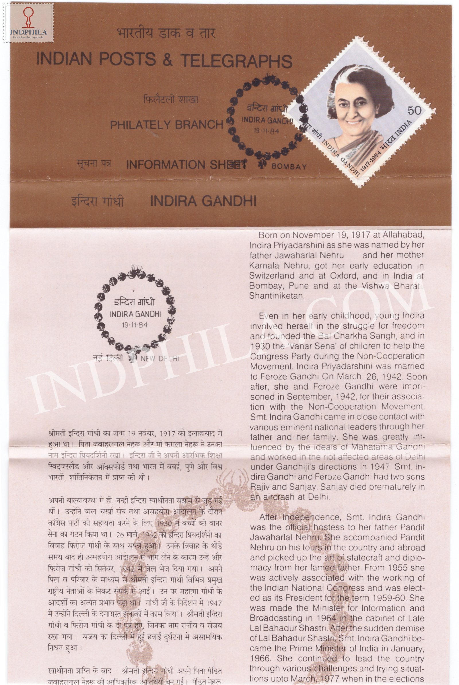 Commemoration of Indira Gandhi Brochure with First Day Cancellation 1984