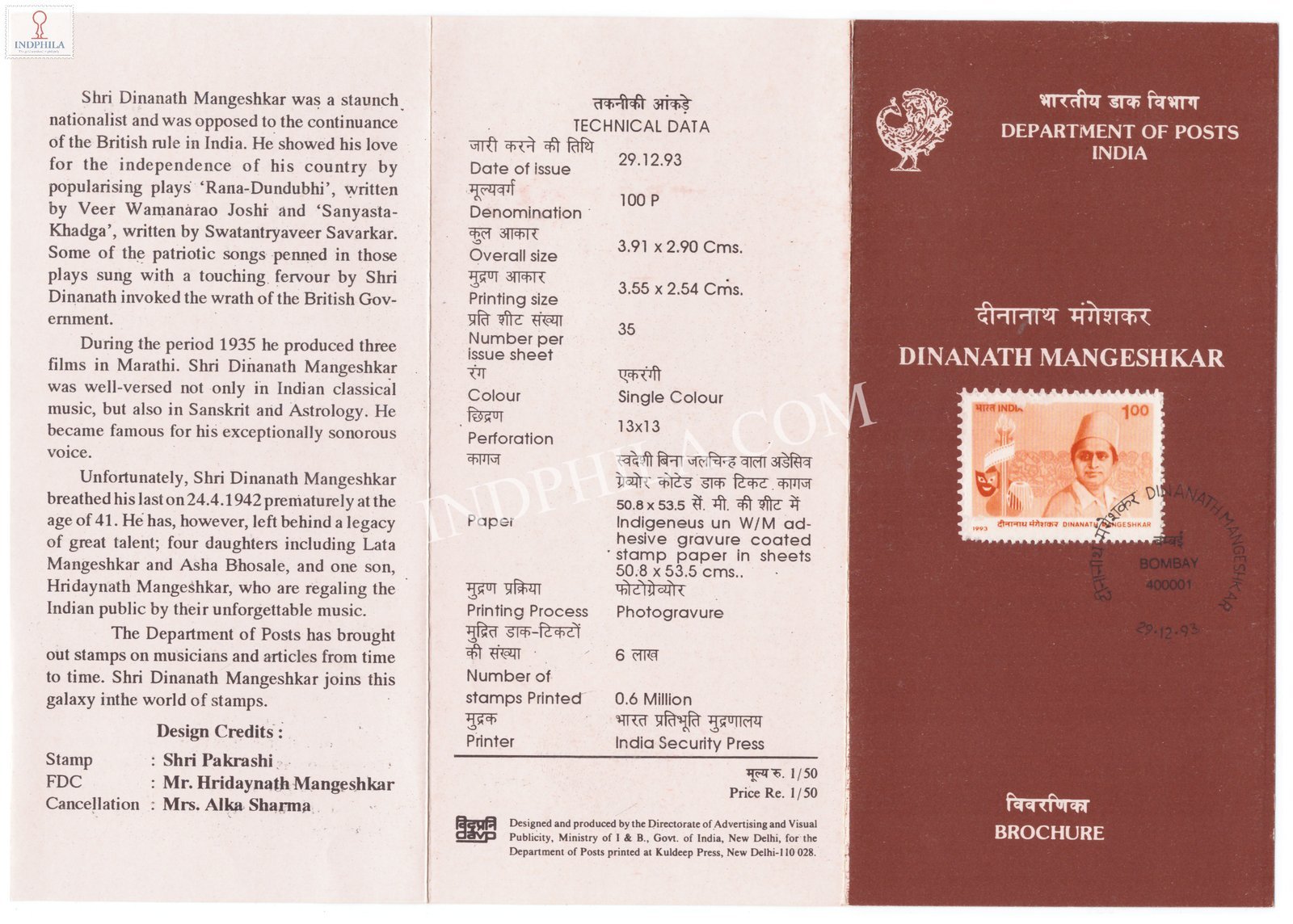 Dinanath Mangeshkar Brochure with First Day Cancelation 1993 Issued By Postal Department