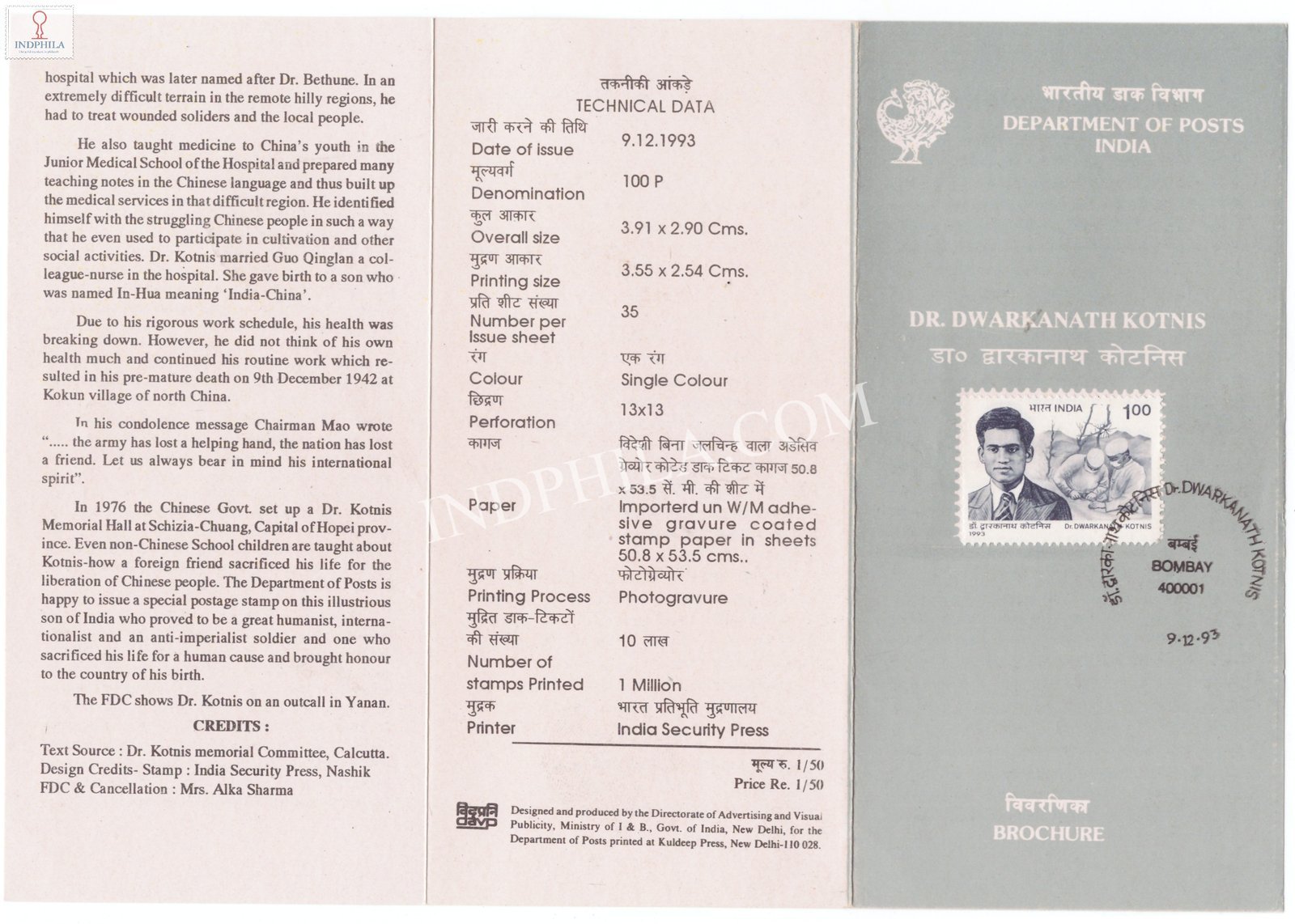 Dr Dwarkanath Kotnis Brochure with First Day Cancelation 1993