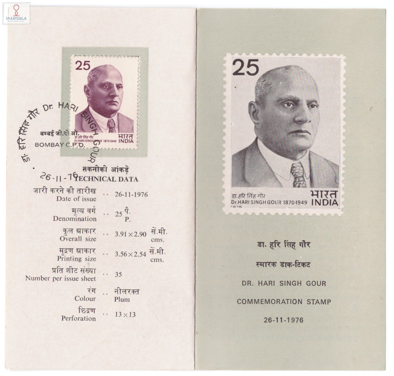 Dr Hari Singh Gour Brochure with First Day Cancellation 1976 Issued By Postal Department