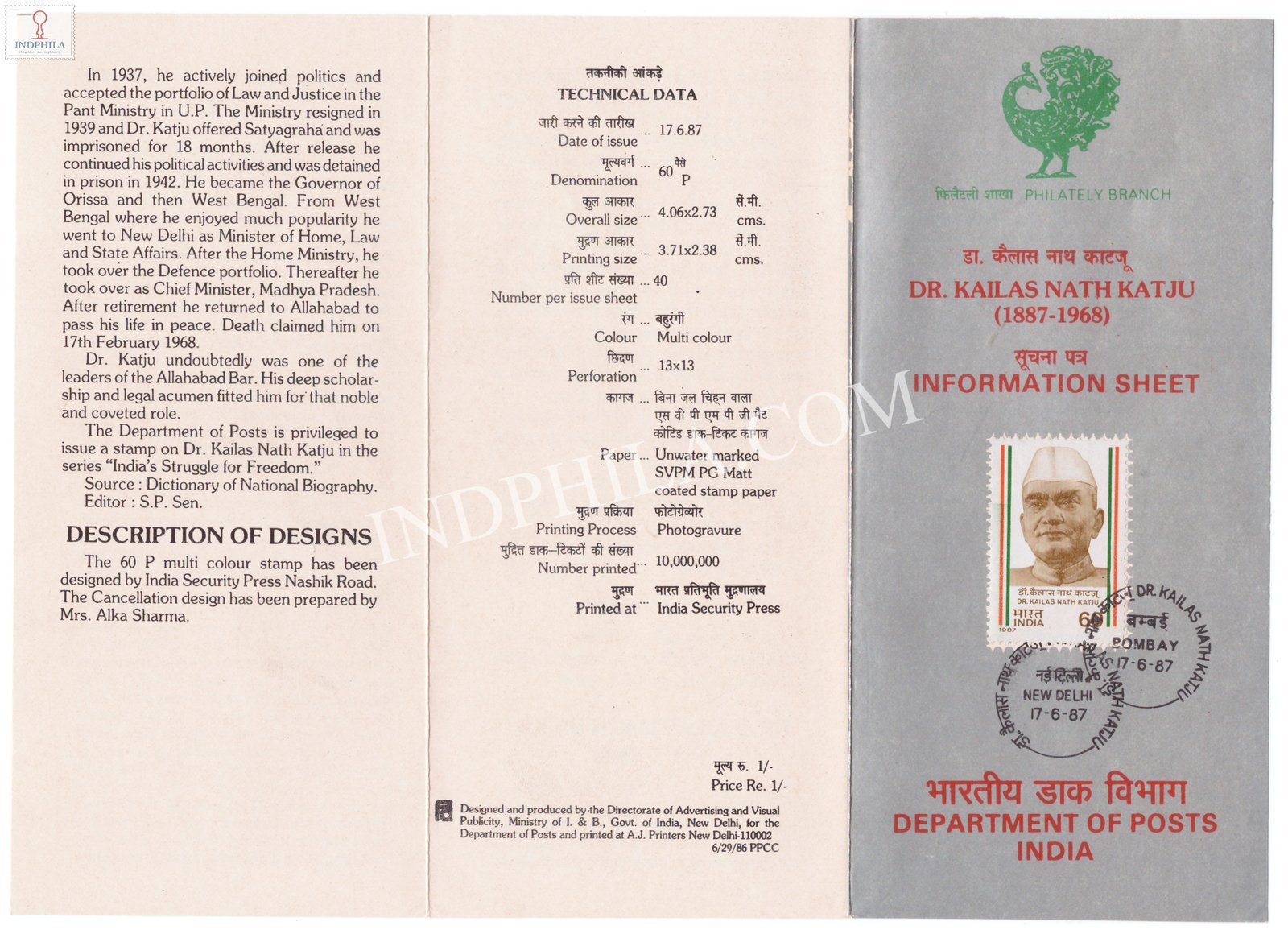 Dr Kailas Nath Katju Birth Centenary Brochure with First Day Cancellation 1987