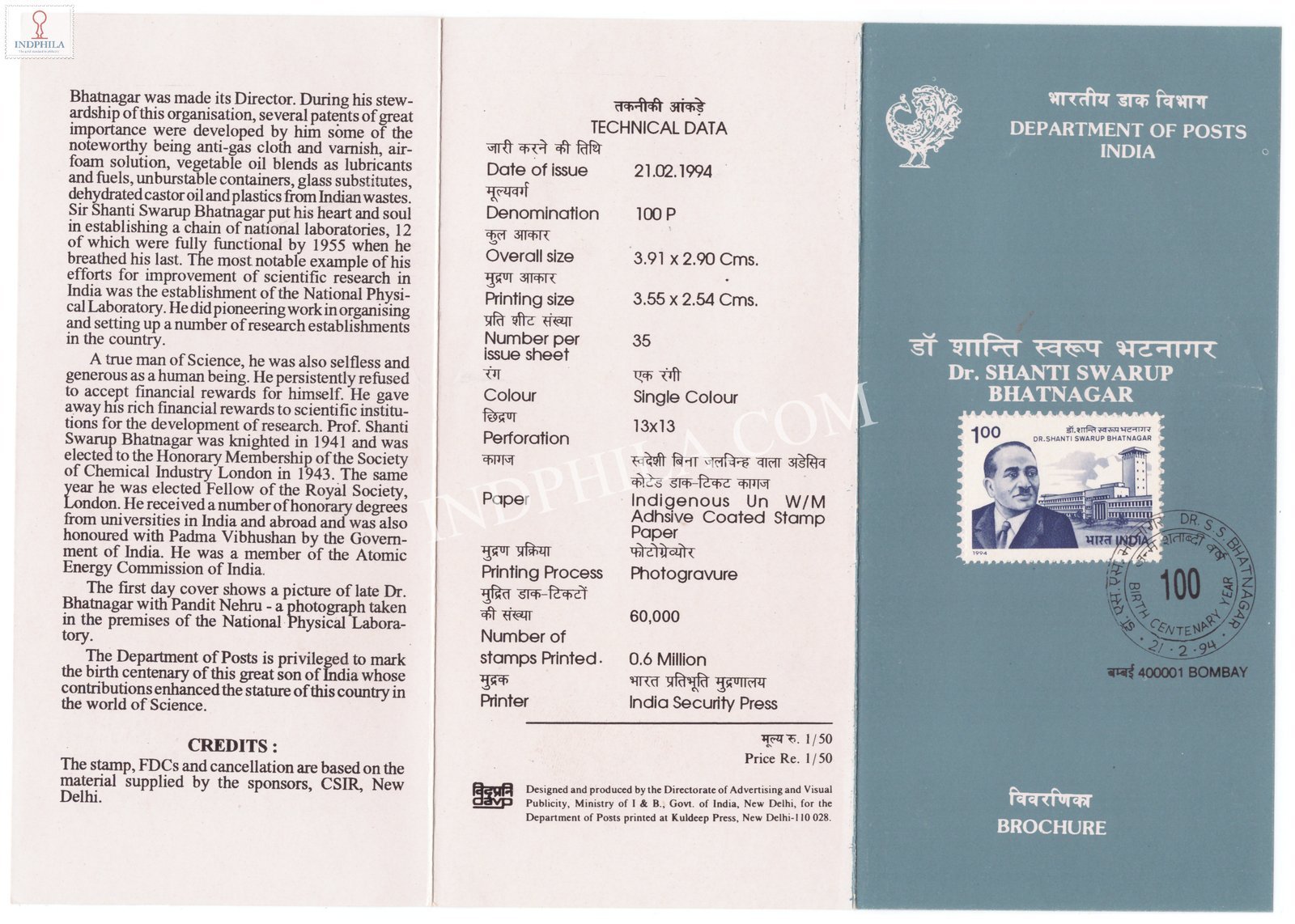 Dr Shanti Swarup Bhatnagar Brochure with First Day Cancelation 1994