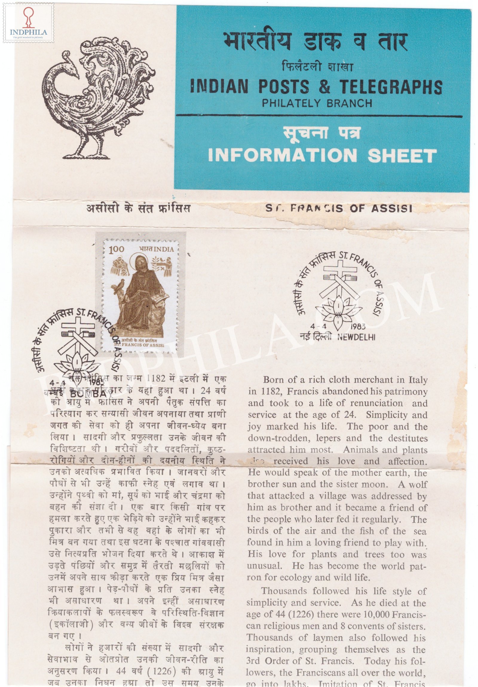 First 800th Birth Anniversary of St Francis of Assisi Brochure with First Day Cancellation 1983