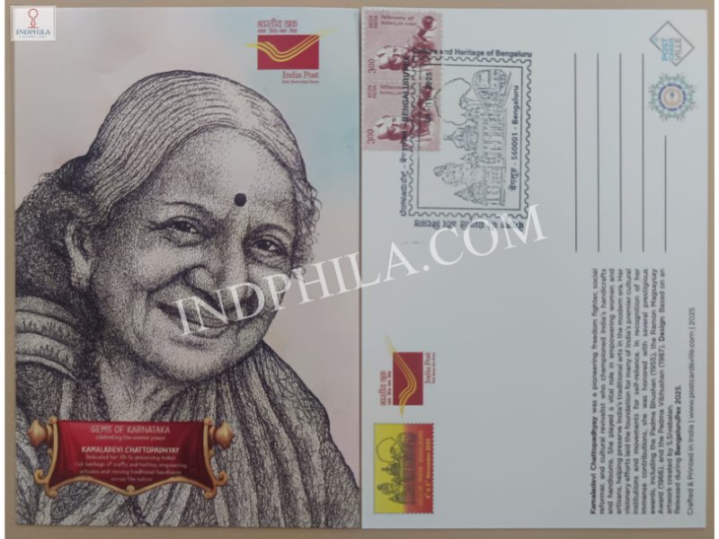 Gems of Karnataka Kamaladevi Chattopadhyay Cancelled Picture Postcard of Released On The Occasion Bengalurupex 2025 Issued By India Post