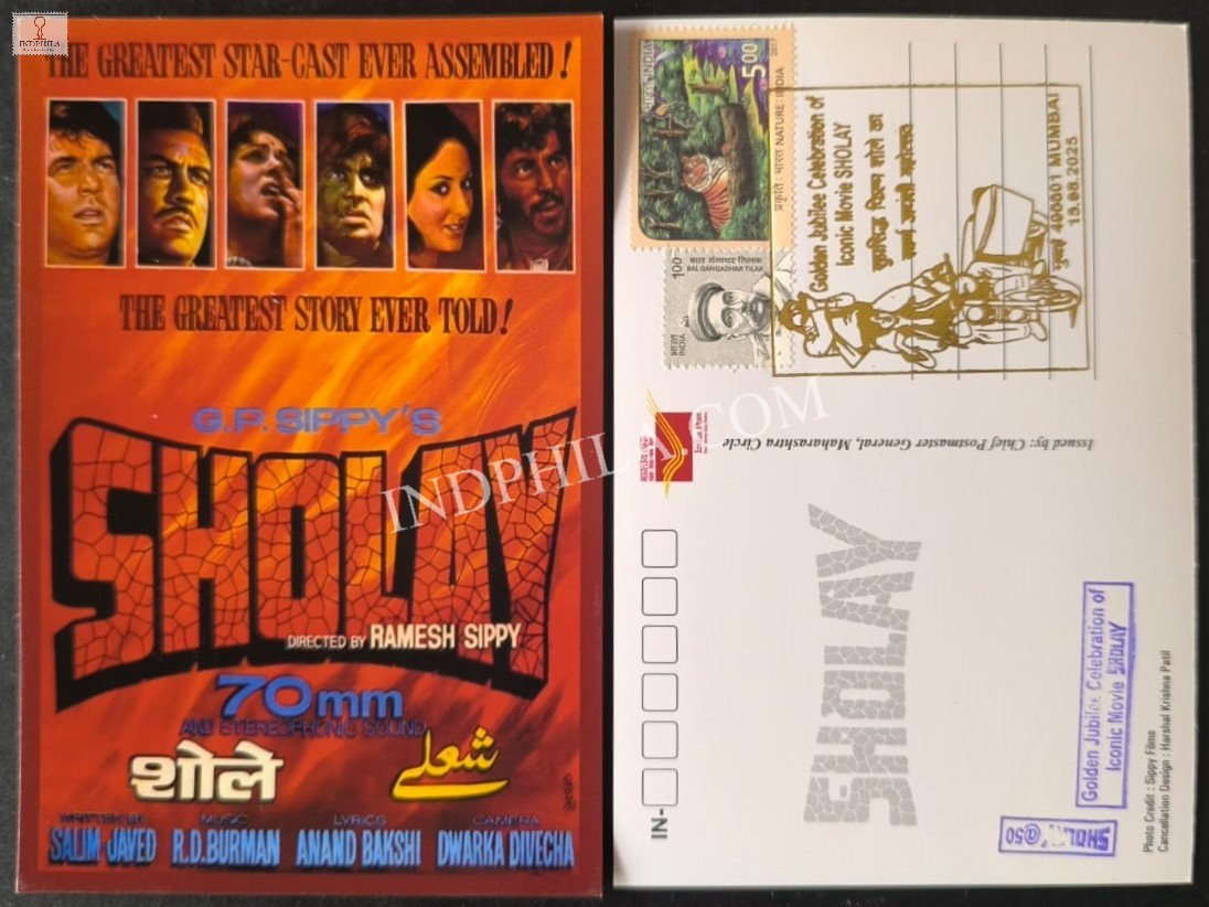 Golden jubilee Celebration of Iconic Movie Sholay Cancelled Picture Post Card (Golden Colour Cancellation)