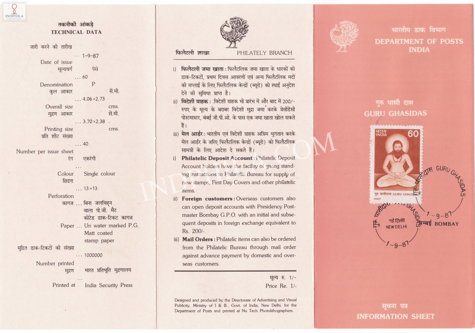 Guru Ghasidas Brochure with First Day Cancellation 1987 Issued By Postal Department
