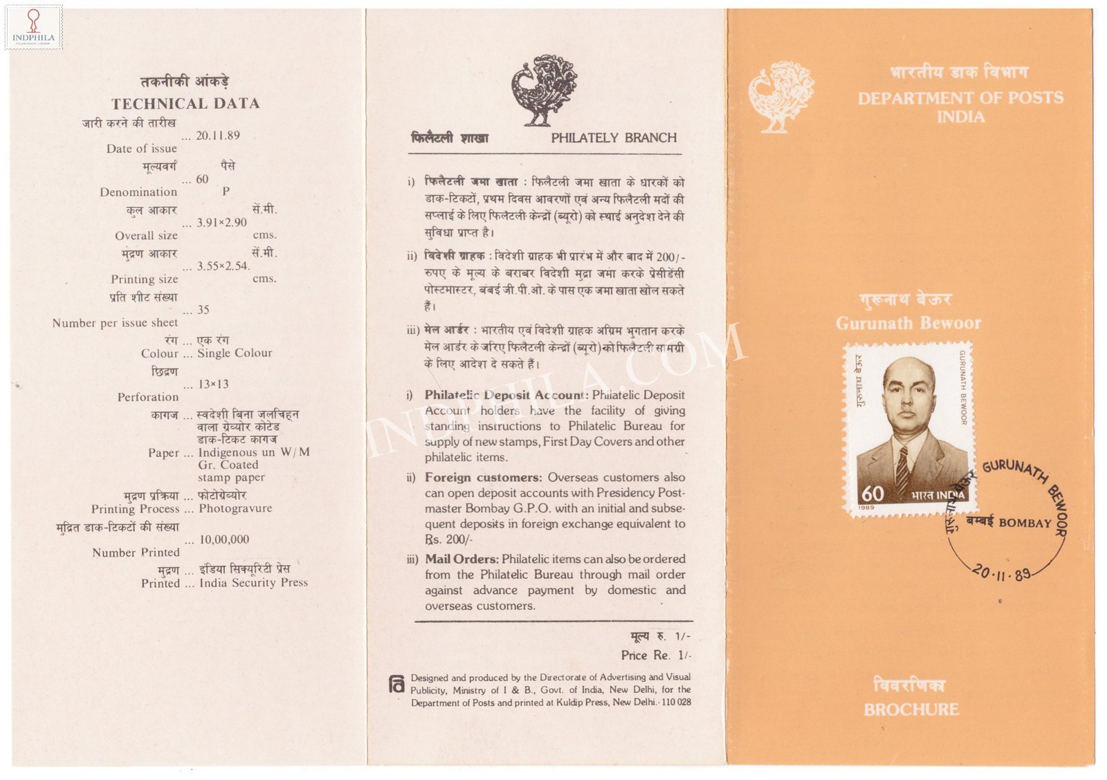 Gurunath Bewoor Brochure with First Day Cancellation 1989