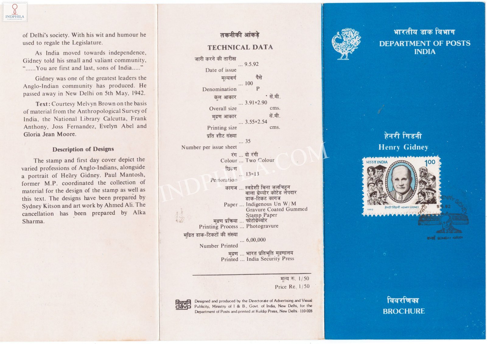 Henry Albert John Gidney Brochure with First Day Cancelation 1992 Issued By Postal Department