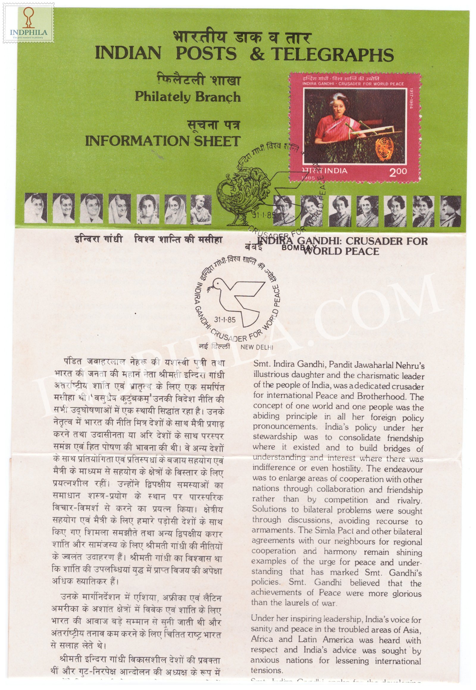India 1985 Indira Gandhi Crusader For World Peace Brochure with First Day Cancellation 1985 Issued By Postal Department