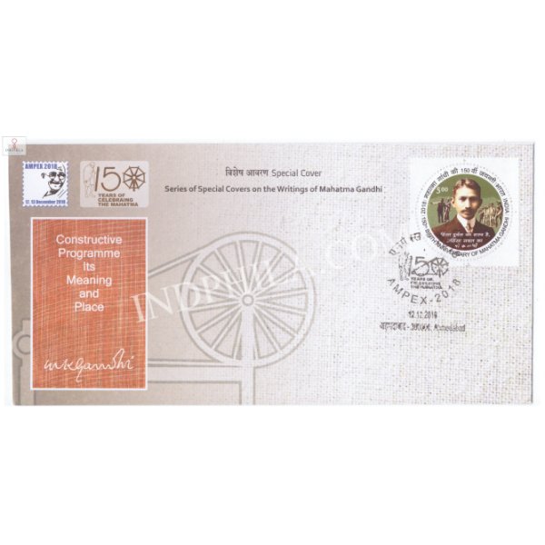 Mahatma Gandhi Special Cover of Ampex 2018 Writing of Mahatma Gandhi Constructive Programme its Meaning and Place was released on 12th December 2018 from Ahmedabad