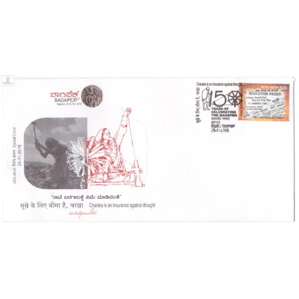 Mahatma Gandhi Special Cover of Bagapex 2018 Charaka is an Insurance against drought was released on 25th November 2018 from Bagalkot – Issued By India Post