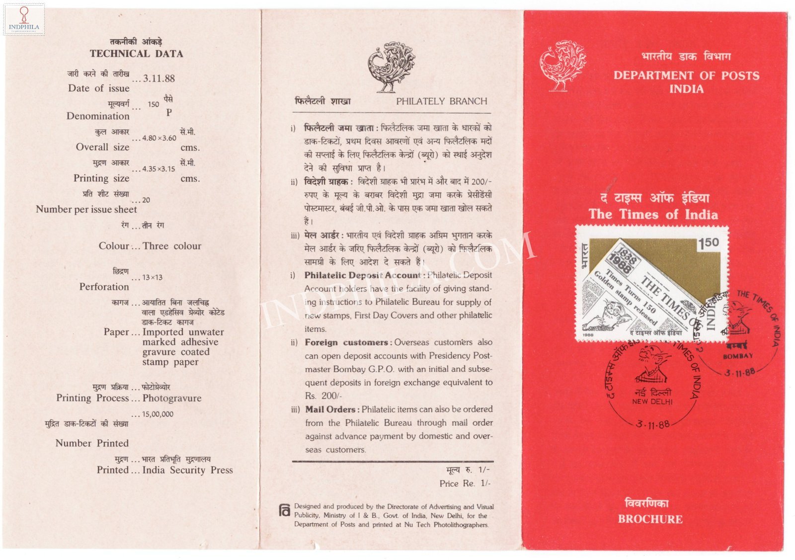 India 89 150th Anniv of The Times of India Brochure with First Day Cancellation 1988 Issued By Postal Department