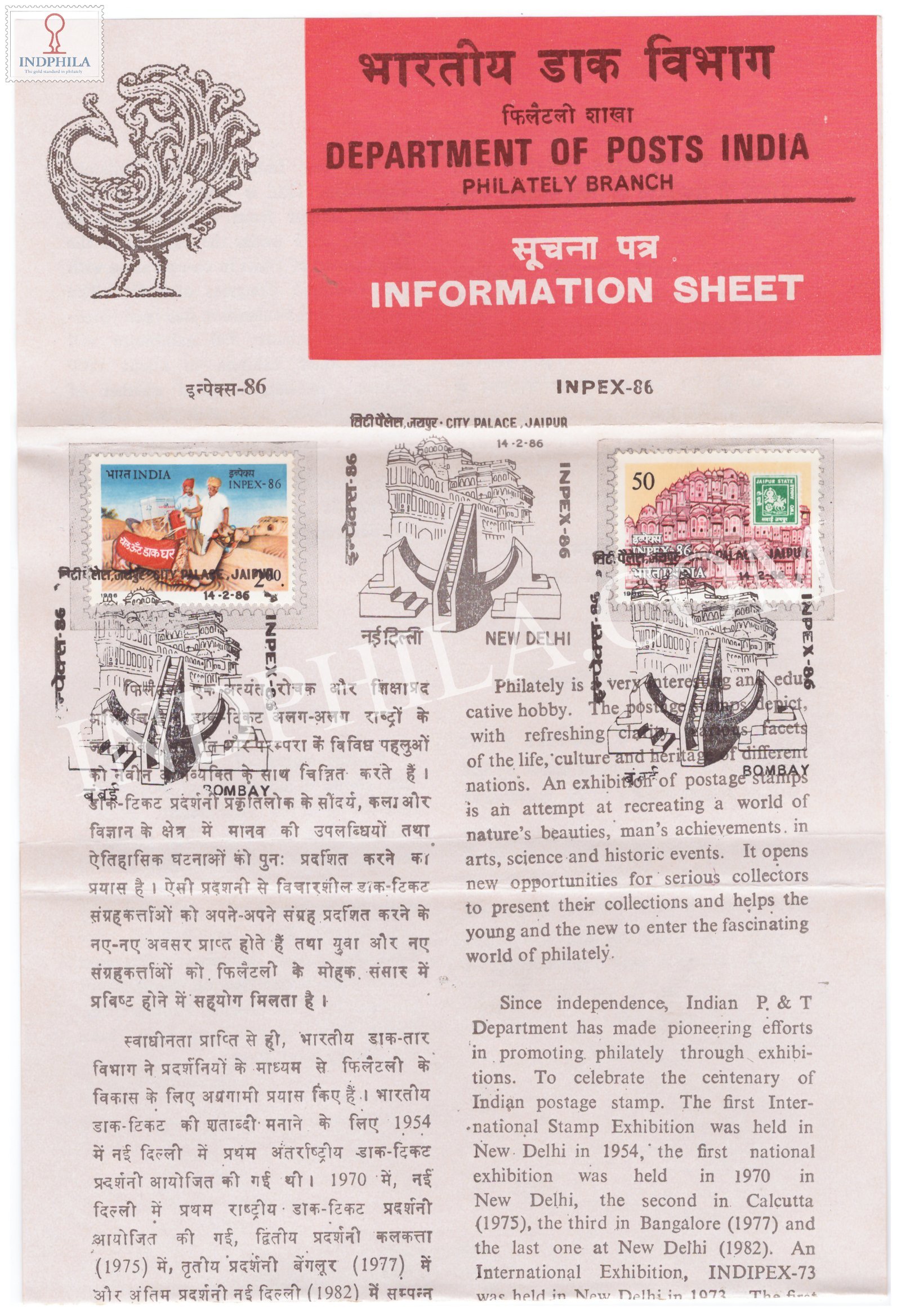 Inpex 86 5th India National Philatelic Exhibition Jaipur Brochure with First Day Cancellation 1986 Issued By Postal Department