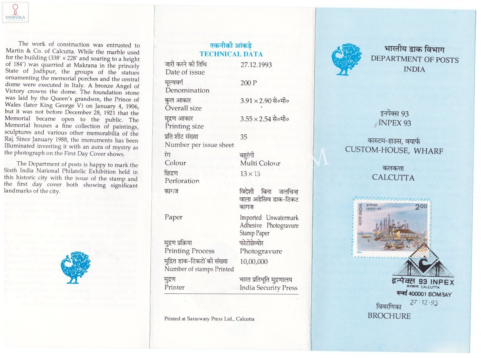 Inpex 93 Indian National Philatelic Exhibition Calcutta Custom House Wharf Brochure with First Day Cancelation 1993