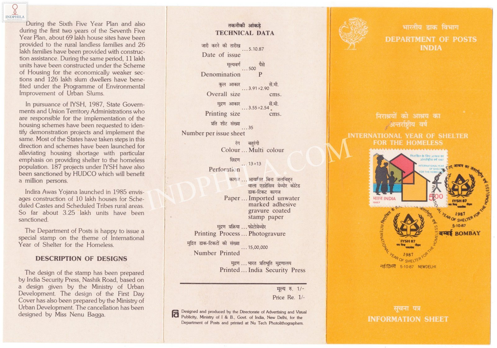 International Year of Shelter for the Homeless Brochure with First Day Cancellation 1987 Issued By Postal Department