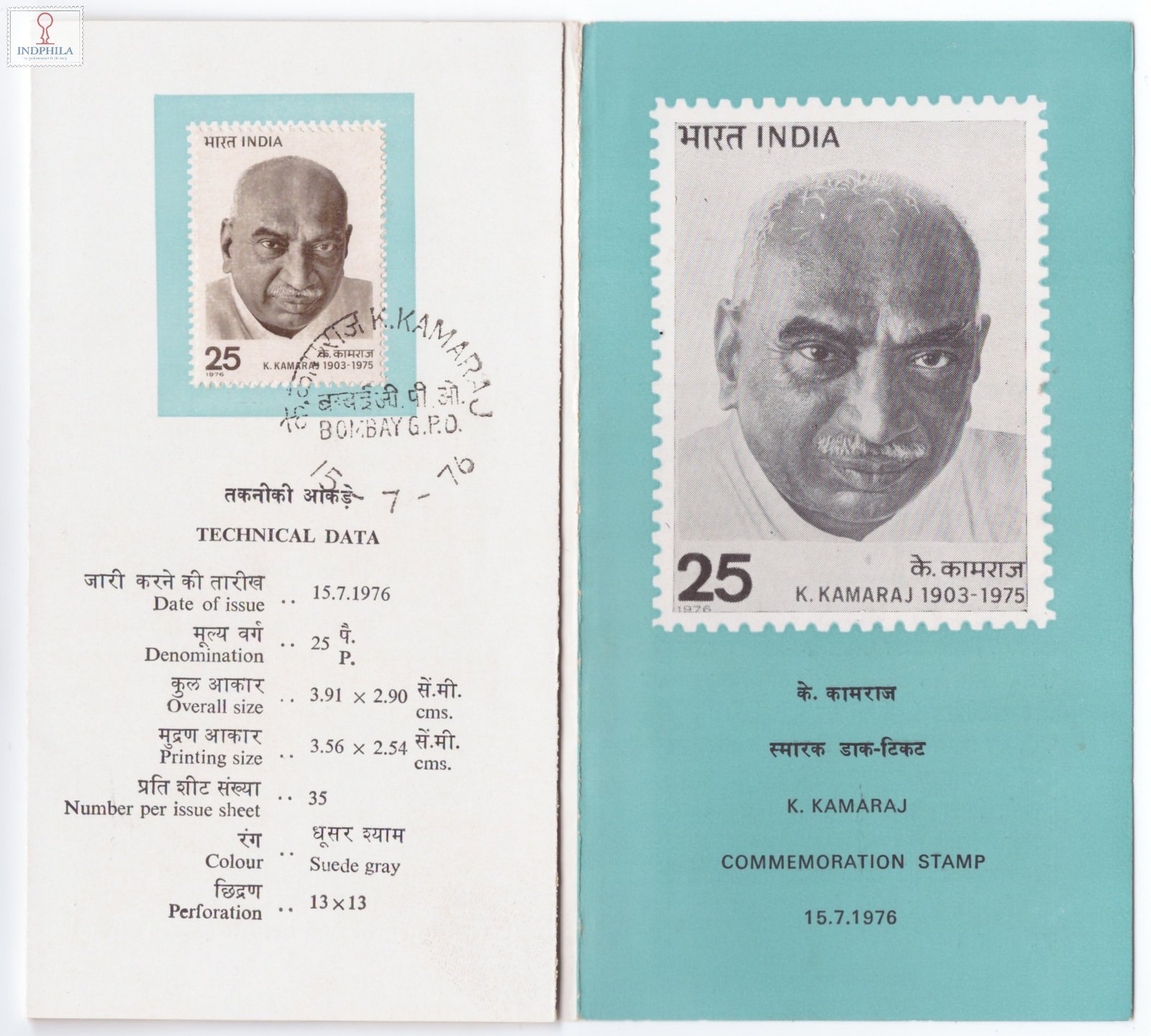 Kumaraswamy Kamaraj Brochure with First Day Cancellation 1976
