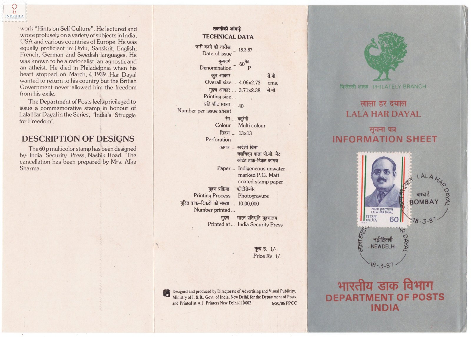 Lala Har Dayal Brochure with First Day Cancellation 1987