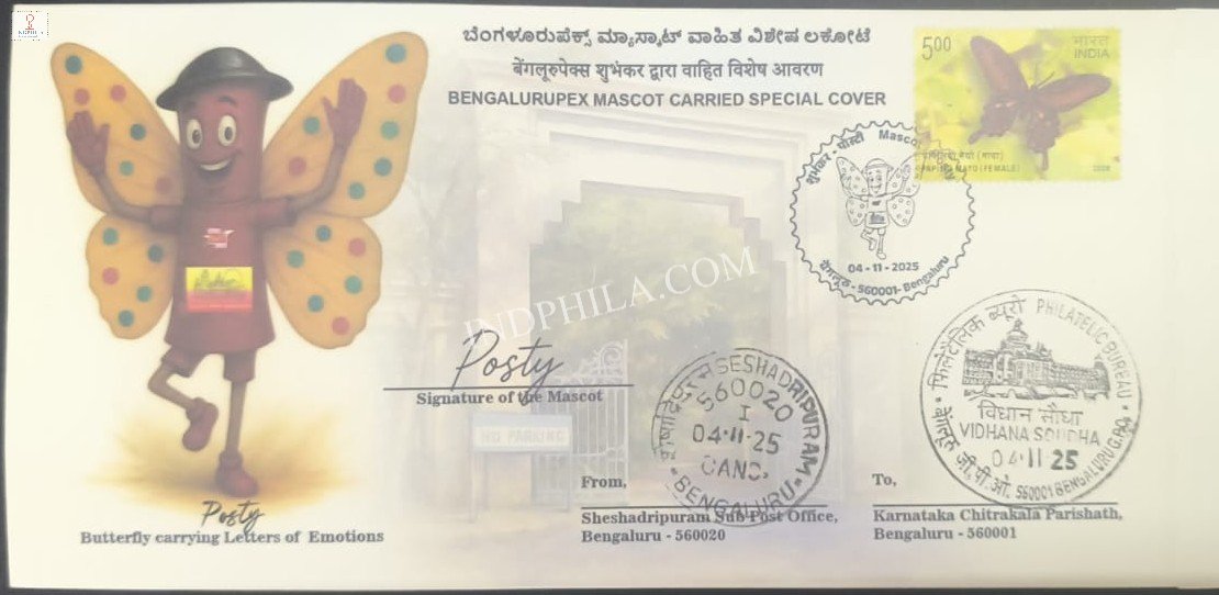 Mascot Carried Special Cover – ‘Posty’ Butterfly Carrying Letters of Emotions was released on 4th November 2025 on the occasion of BengaluruPEX-2025