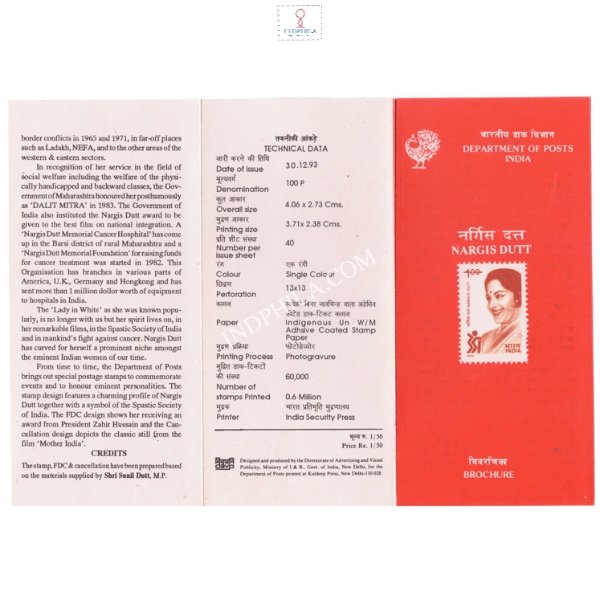 Plain Brochure Of Nargis Dutt Issued In 1993
