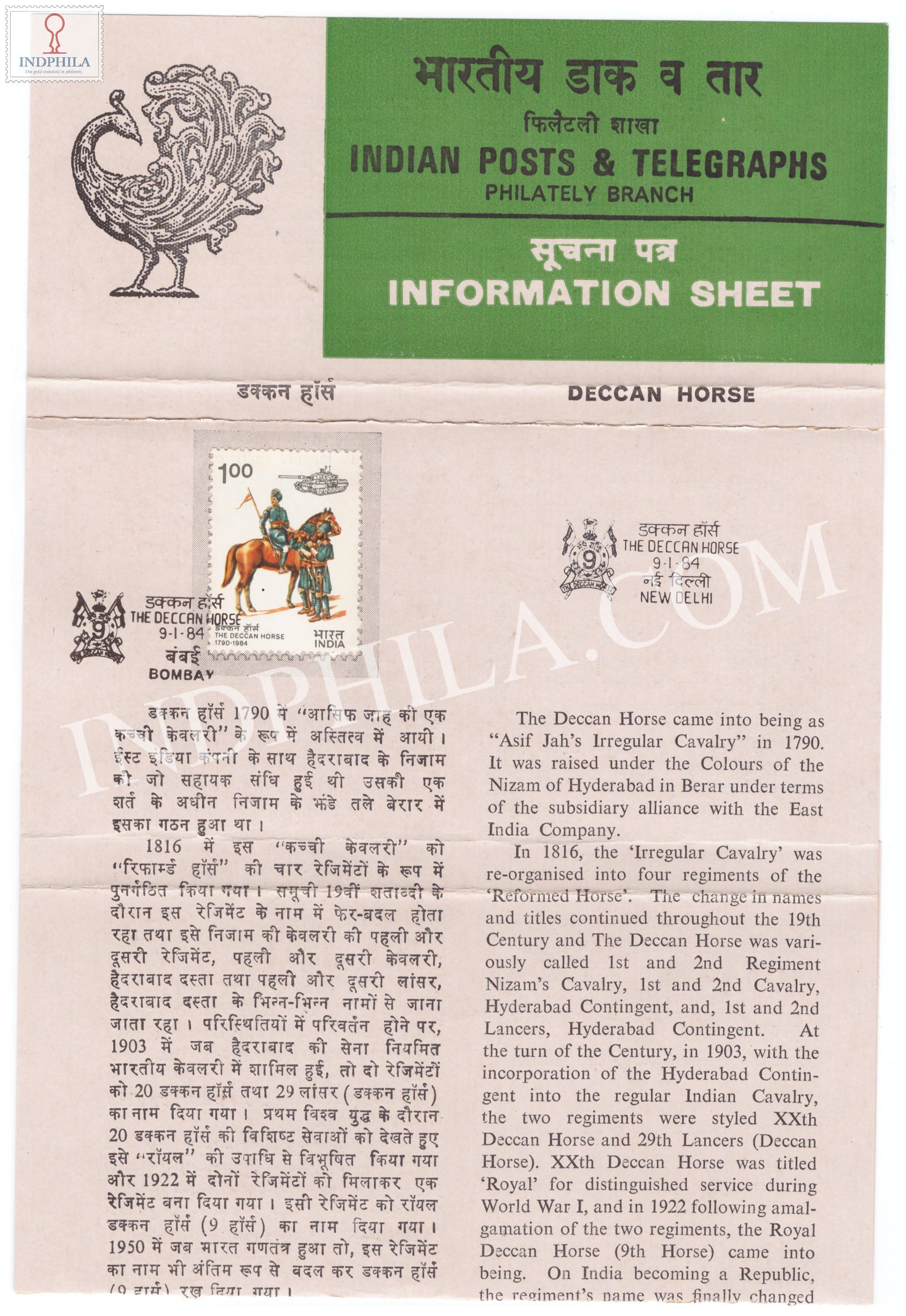 Presentation of Regimental Guidon to The Deccan Horse Brochure with First Day Cancellation 1984 Issued By Postal Department