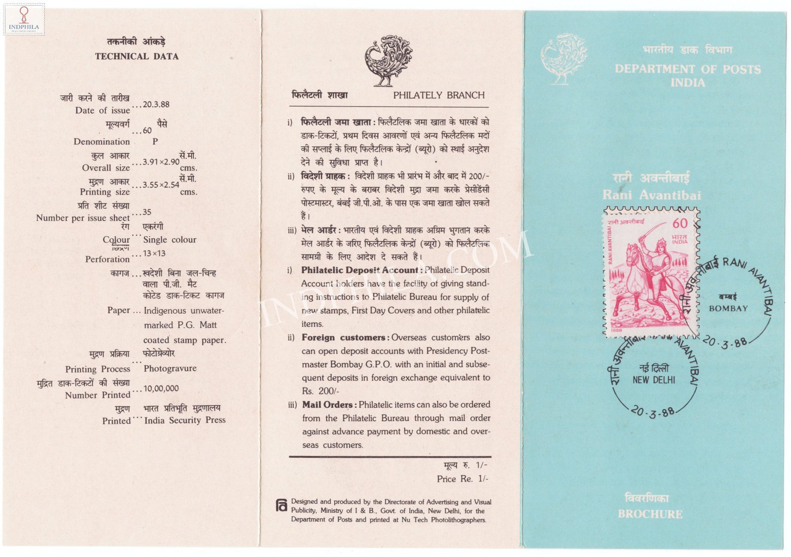 Rani Avantibai of Ramgarh Madhya Pradesh Brochure with First Day Cancellation 1988 Issued By Postal Department