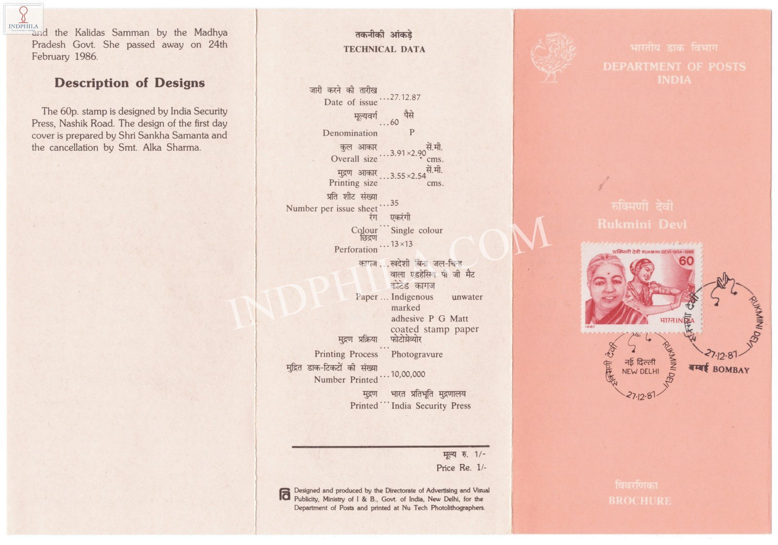 Rukmini Devi Brochure with First Day Cancellation 1987 Issued By Postal Department
