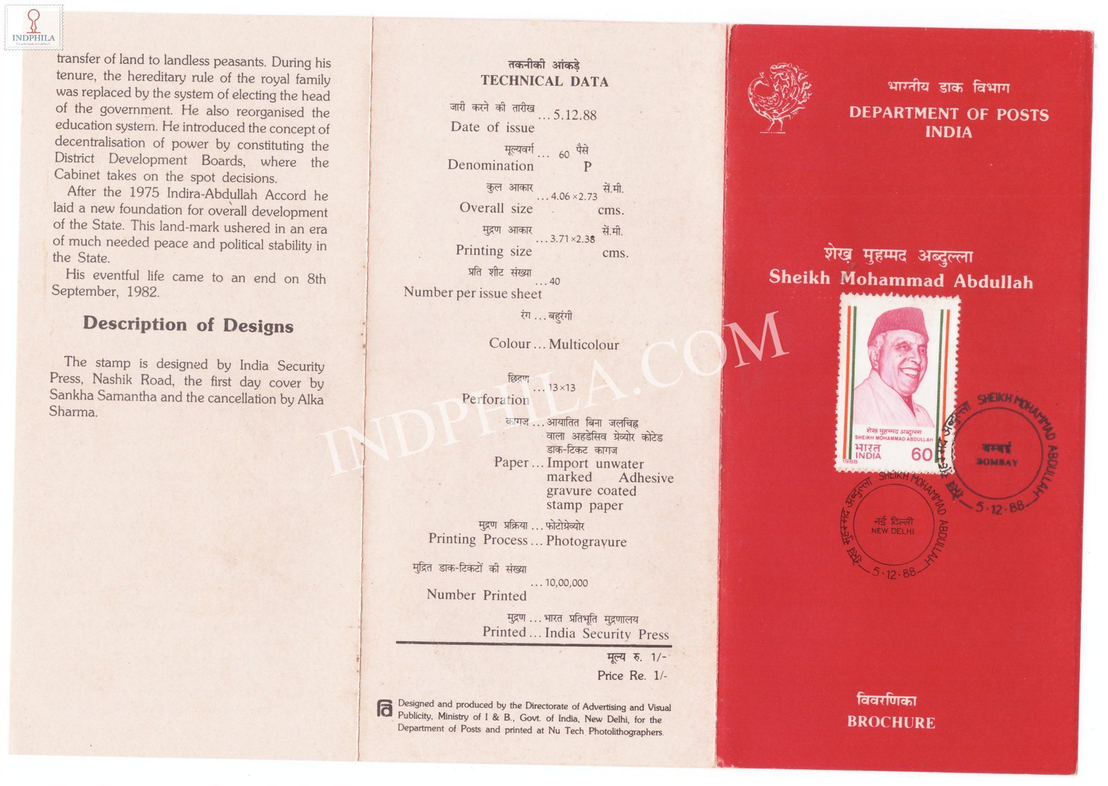 Sheikh Mohammad Abdullah Brochure with First Day Cancellation 1988 Issued By Postal Department