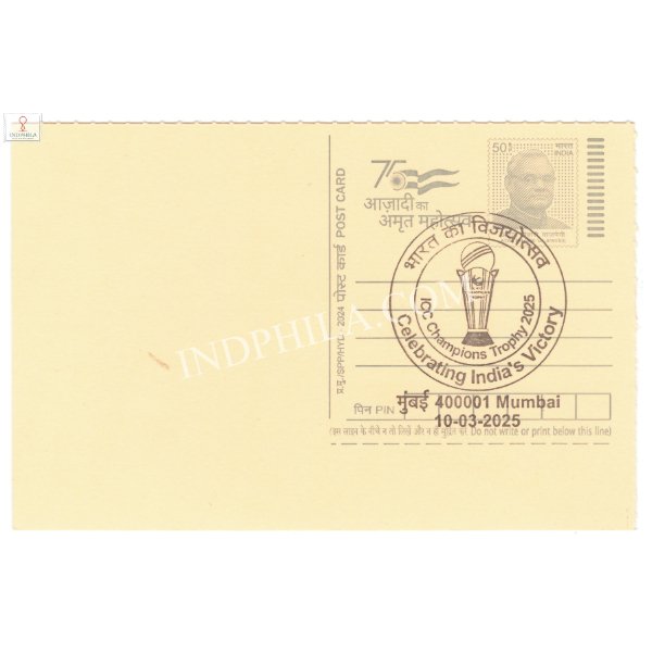 Special Cancellation of ICC Champions Trophy 2025 Celebrating India’s Victory on Postal Stationery Postcard