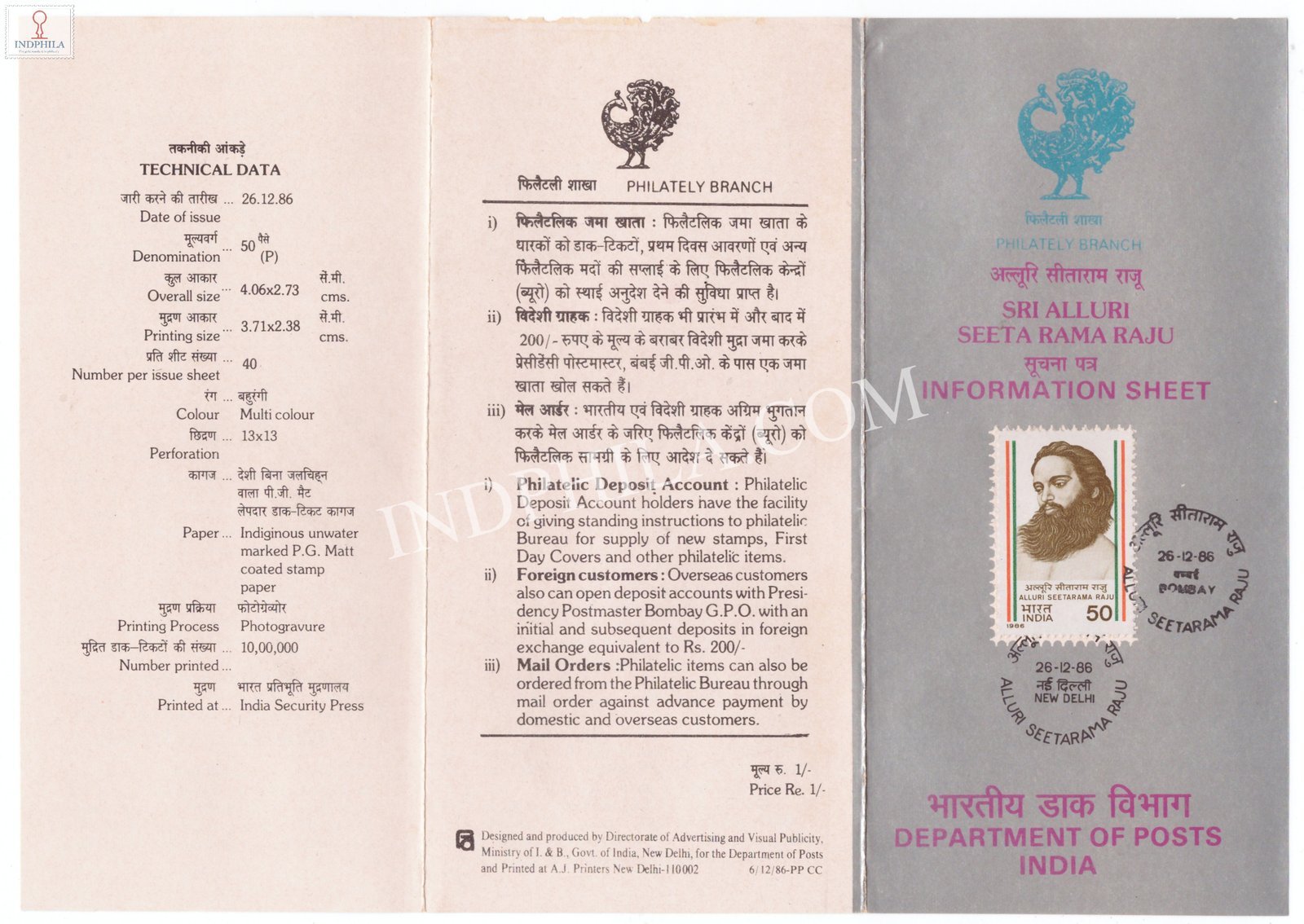 Sri Alluri Seetarama Raju Brochure with First Day Cancellation 1986 Issued By Postal Department