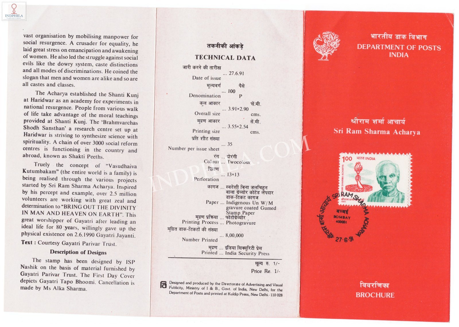 Sri Ram Sharma Acharya Brochure with First Day Cancelation 1991 Issued By Postal Department