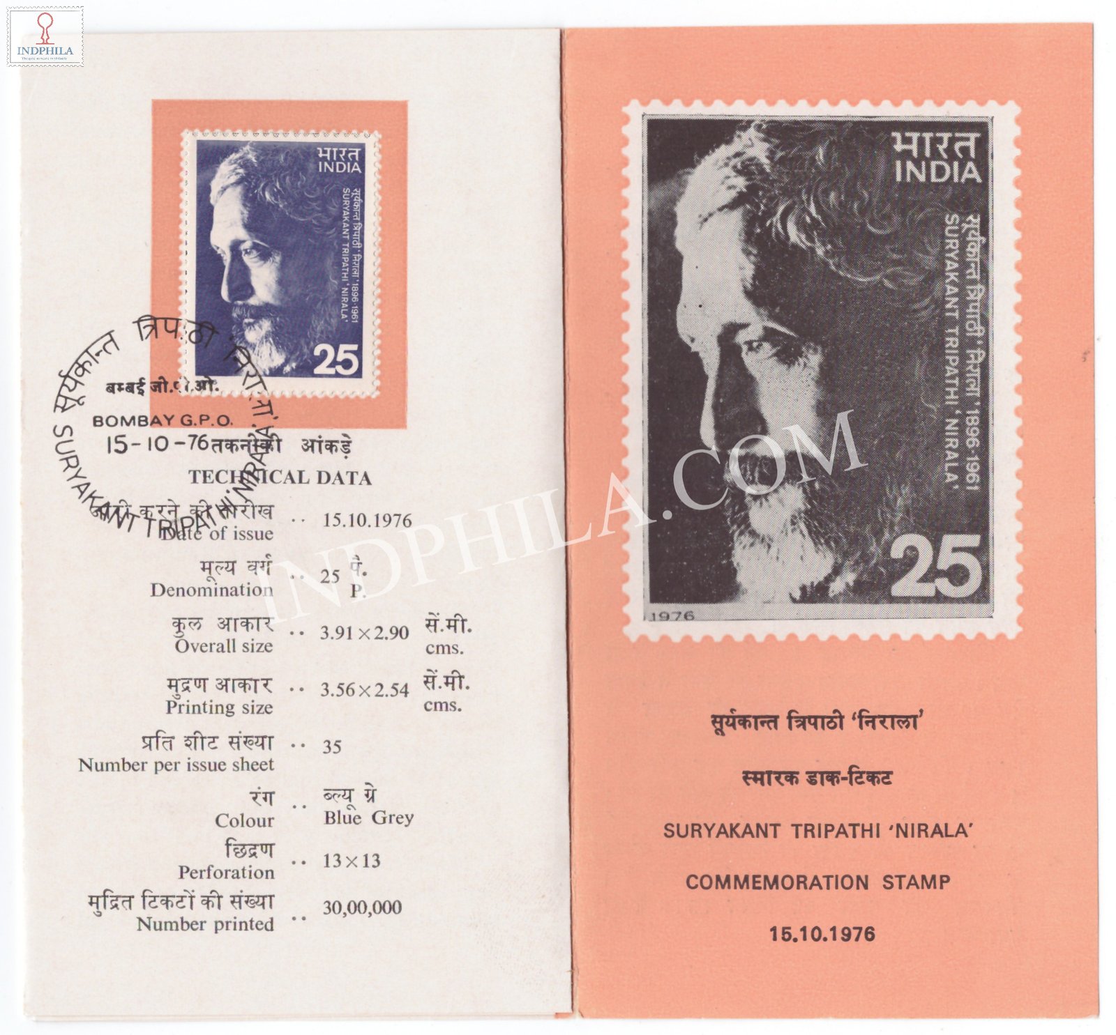 Suryakant Tripathi Nirala Brochure with First Day Cancellation 1976 Issued By Postal Department