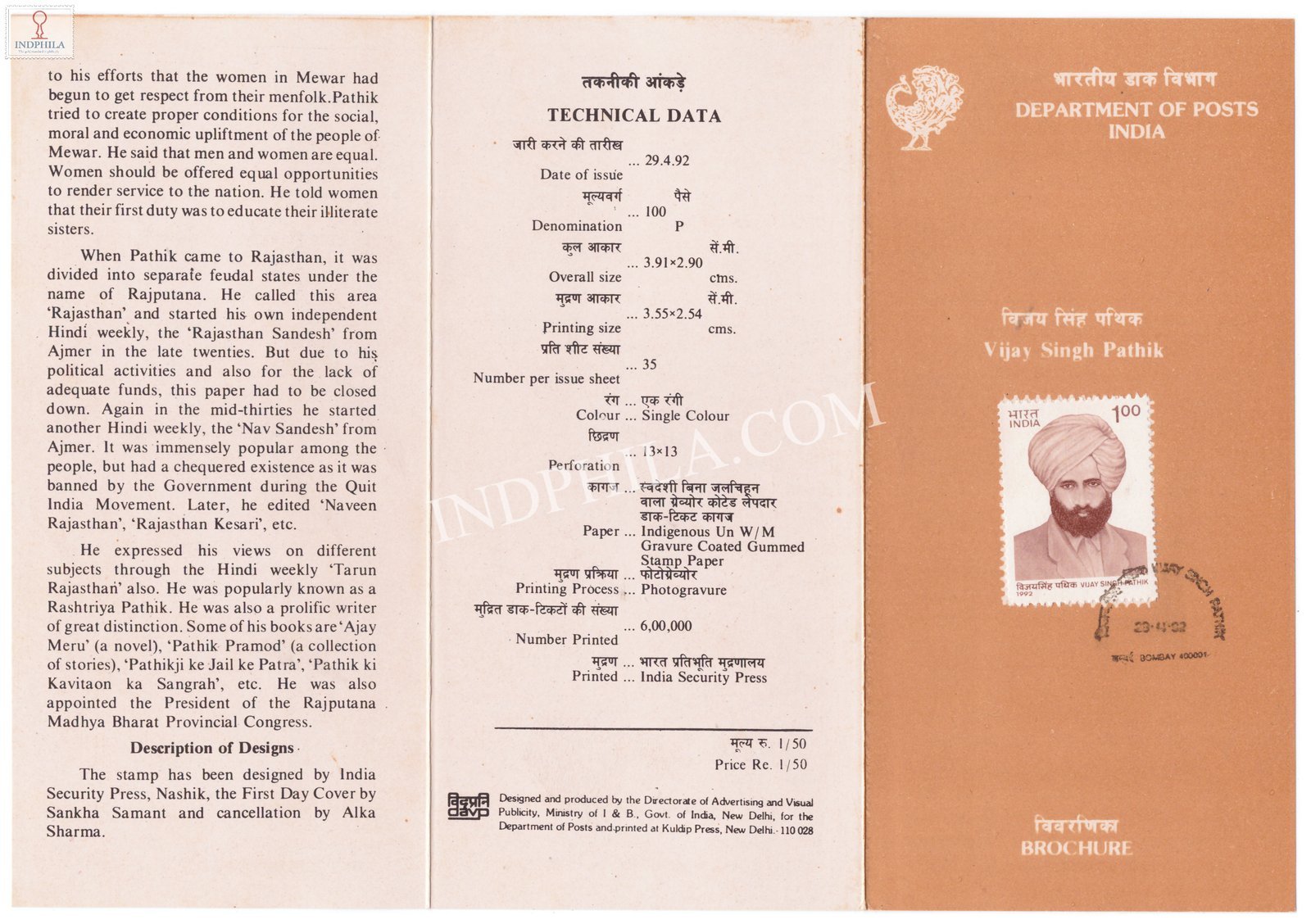 Vijay Singh Pathik Brochure with First Day Cancelation 1992