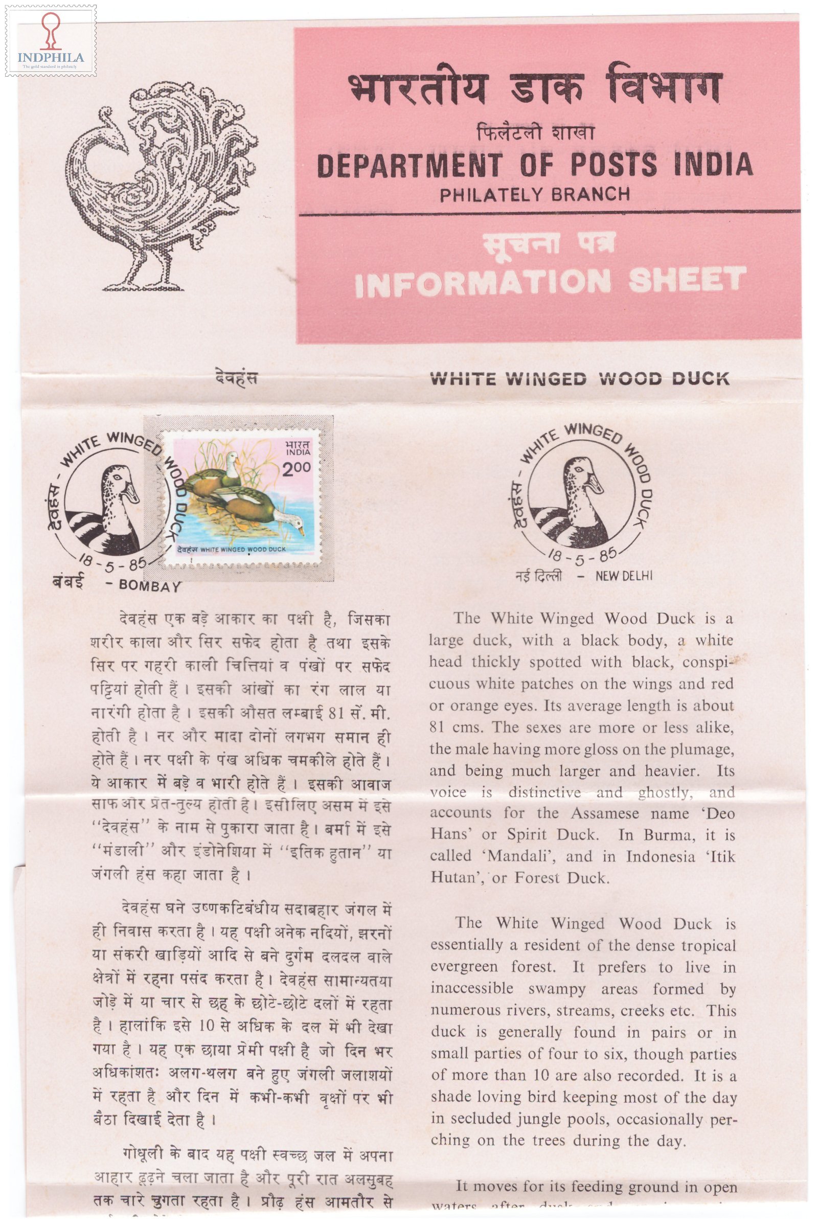 White Winged Wood Duck Brochure with First Day Cancellation 1985 Issued By Postal Department